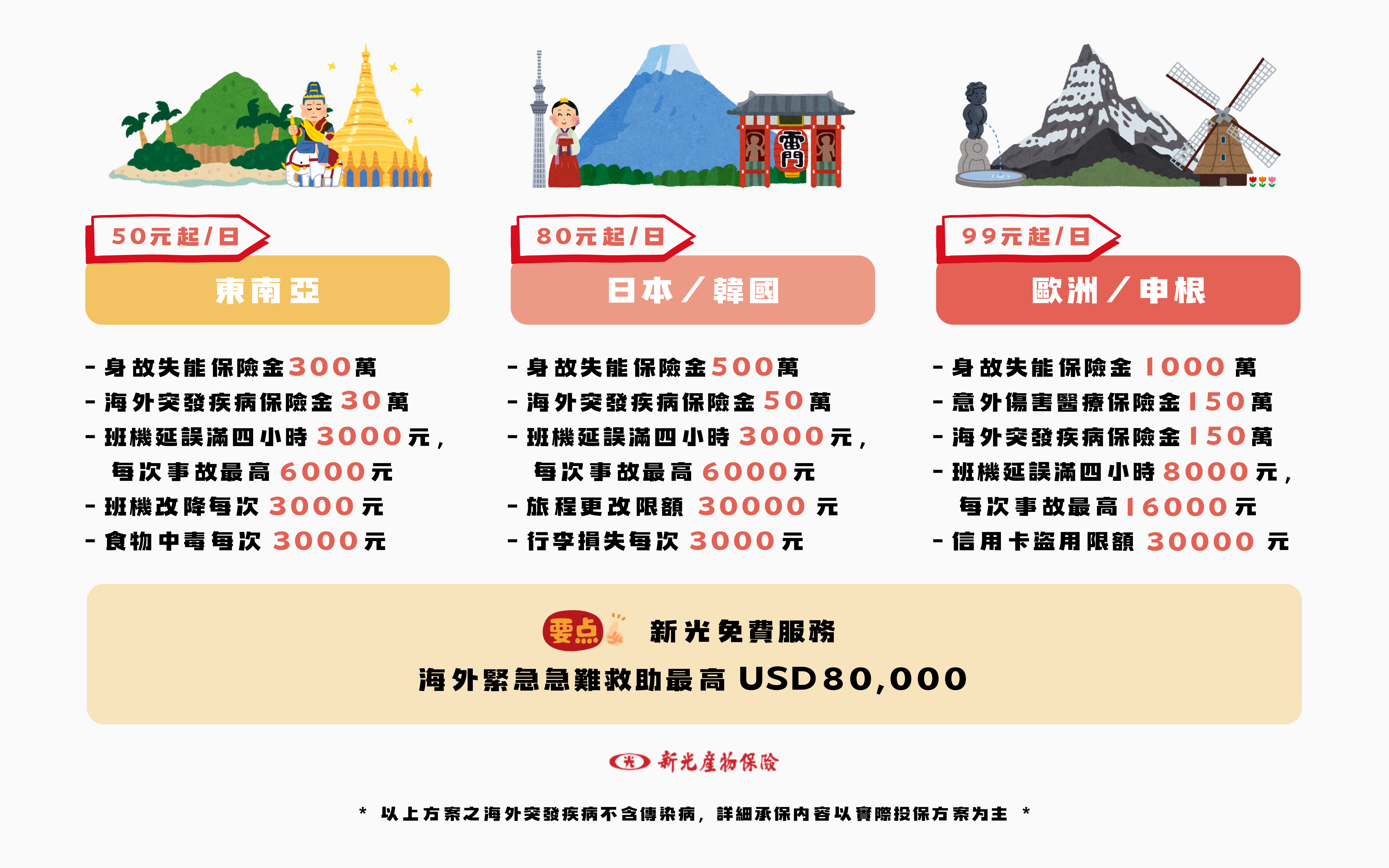 挑選旅遊險不只看價格,更要看行程與風險。根據不同旅遊地區與典型需求,新光產險提供彈性方案搭配,讓你安心出國不踩雷: